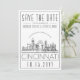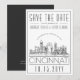 Una invitación única de "Save the date" para una boda que tendrá lugar en la hermosa ciudad de Cincinnati, Ohio. Esta invitación presenta una ilustración estilizada de la silueta única de la ciudad con su nombre debajo. A esto le sigue la información de su boda en un estilo abierto y delineado coincidente. En el reverso de la invitación hay un color gris oscuro para complementar la apariencia y sensación. Todos los elementos individuales de la tarjeta de invitación están desbloqueados, así que siéntase libre de cambiar cualquier detalle necesario, como tamaños de fuente, estilos y más, utilizando la función de personalización. Puede agregar una foto al reverso y aplicarle un filtro en blanco y negro. Diviértase siendo creativo y haciendo que sea suyo.