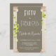 Diseño de temática griega de columnas antiguas con viñas en cascada que enmarcan con gusto la invitación a la fiesta de 50 años. Tonos cálidos y suaves de tierra beige, arena y un toque de verde vitivinícola. El elegante texto blanco sobre un fondo marrón chocolate / taupe complementa el diseño, haciéndolo elegante y fácil de ver.