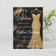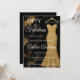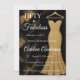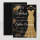 Invitación de cumpleaños número 50 minimalista de color negro, dorado, blanco, mármol, brillo moderna que puedes personalizar y enviar para la celebración de tus cincuenta años. Las palabras "Cincuenta y fabuloso" están colocadas sobre un fondo de mármol negro y dorado elegante, con tipografía de letra blanca popular, junto a un vestido de noche sin tirantes, elegante y sofisticado con brillo dorado. Diviértete personalizando el nombre, fecha y hora, ubicación y RSVP con la herramienta de edición.