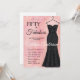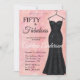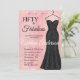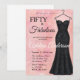 Una elegante escritura de "Cincuenta y fabuloso", acuarela suave rosa, vestido de lentejuelas negras, invitación moderna para cumpleaños número 50 que puedes personalizar y enviar para celebrar tu fiesta de cumpleaños cincuenta. Las palabras "Cincuenta y fabuloso" están sobre un fondo de acuarela rosa, con tipografía de fuente de escritura negra y blanca popular y elegante, colocada junto a un elegante, sofisticado y glamuroso vestido de gala negro sin tirantes con lentejuelas. Diviértete personalizando el nombre, fecha y hora, ubicación y RSVP con la herramienta de edición.