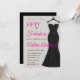 Una elegante invitación de cumpleaños número 50 con una tipografía elegante, negra, rosa intenso y brillo plateado que puedes personalizar y enviar para celebrar tus cincuenta años. Las palabras "Cincuenta y fabuloso" están sobre un fondo brillante plateado, con una tipografía de fuente negra y rosa intenso de moda, colocada junto a un elegante, sofisticado y glamuroso vestido de noche negro sin tirantes con brillo. Diviértete personalizando el nombre, fecha y hora, ubicación y RSVP con la herramienta de edición.