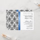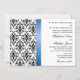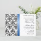 © 2013 Socialite Designs. Nuestra invitación a la boda en blanco y negro con damasco tiene una falsa cinta de satén azul real. Todos los elementos de diseño y texto son personalizable. Si necesita productos bodas adicionales que coincidan, como guardar la fecha o tarjetas de fotos de agradecimiento, no dude en ponerse en contacto con los Diseños de Socialite. POR FAVOR, TENGA EN CUENTA QUE LA IMAGEN DE RIBBON SE IMPRIME EN LA INVITACIÓN.