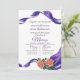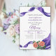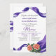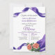 Hermosas cintas de púrpura real realzadas con flores para una simple pero elegante invitación formal a la boda. Presentado aquí sobre el material básico de tarjetas de papel blanco con enfoque presupuestario (puede cambiar esta opción, si lo desea) con impresión de alta definición. Actualice fácilmente con su información específica para su día especial con la plantilla fácil de usar. Medidas 5"x7".