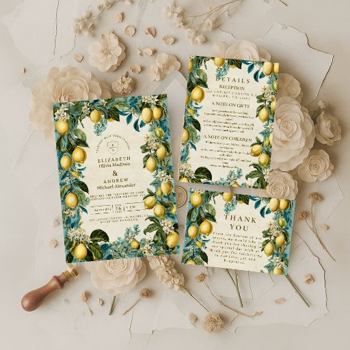 A romantic blend of vintage elegance and fresh citrus charm, this lemon blossom botanical design creates a warm, sunlit atmosphere perfect for timeless celebrations. Soft cream tones pair with hand-painted florals and golden citrus accents to frame your event details with refined artistry. Ideal for couples who love nature-inspired aesthetics, Mediterranean motifs, or a sophisticated garden ambiance, this design brings a gentle, organic beauty to your special day.