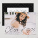 Invite a los invitados a celebrar la graduación con nuestras elegantes invitaciones de graduación con foto. La parte frontal de las invitaciones para la fiesta de graduación muestra la foto del graduado con "Clase de 2023" en una superposición de escritura de caligrafía moderna en negro. Personalice la parte frontal de las invitaciones modernas para la fiesta de graduación agregando el nombre del graduado, el nombre de la escuela y el año de graduación. La invitación se invierte para mostrar los detalles de su fiesta de graduación y un patrón geométrico de puntos negro y blanco de moda. El diseño es perfecto tanto para graduados de secundaria como de universidad.