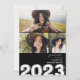 ¿Listo para rodar su ceremonia de graduación? Nuestra invitación audaz de la Clase 2023 le añadirá un toque de creatividad a su día especial! Con una audaz fuente 2023 con contornos (todos los colores se pueden editar) en blanco sobre negro y 3 fotos en la parte posterior con un audaz sobredimensionado 2023.