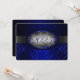 Invitación de graduación azul y plata con rayas azul claro y oscuro y una cinta de plata cruzando mostrando el año de graduación. La parte trasera de la tarjeta es azul con fuente de plata clara para que la gente complete los anuncios de graduación.