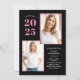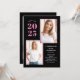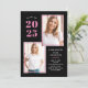 Estas modernas y elegantes invitaciones a la fiesta de graduación incluyen tres fotos del graduado, además de su año de graduación 2025 en negrita, texto rosa sobre un fondo negro oscuro. Los numerosos toques rosas le dan un toque colorido a la parte delantera de la tarjeta.