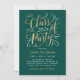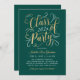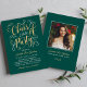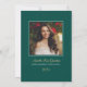 Elegante tarjeta de invitación de graduación de dos caras e invitación a fiesta presenta un elegante diseño de Relieve metalizado de oro falso en escritura con acentos de desplazamiento de bonito. En la parte delantera de la tarjeta también se incluye texto personalizado de color dorado y blanco que se puede personalizar para el evento. La parte trasera de la tarjeta anuncia la graduación con una foto del graduado, su nombre, año de clase y colegio. Se puede modificar el color de fondo verde esmeralda. Consejo de la foto: recortar la segunda foto en un formato cuadrado antes de subirla al sitio.