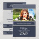 Tema clásico y contemporáneo con rayas azules y acentos grises suaves para este tema de graduación. Agregue la foto de grad al frente, con el nombre y el año de clase, y luego personalizar la parte posterior con los detalles del evento.