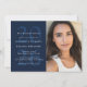 Para tu graduado de secundaria o universitario, esta tarjeta de foto única puede ser usada como una invitación de fiesta, ¡una invitación o ambas! Con un gran año detrás de los detalles del fiesta, hay espacio para que los padres anuncien su grado, un nombre completo y todos los detalles del fiesta. La espalda tiene un patrón de rayas blancas. El color es azul marino de forma predeterminada, pero se puede editar haciendo clic en "Personalizar".