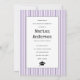 Clase de 2023 tipewriter rayas violetas invitación a la graduación. En la parte trasera se ha optado por un patrón morado y blanco con rayas.