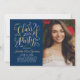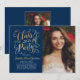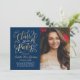 Elegante tarjeta de invitación de graduación de dos caras e invitación a fiesta incluye un retrato del graduado con un elegante diseño de Relieve metalizado de oro falso adyacente en escritura con acentos de bonito. En la parte delantera de la tarjeta también se incluye texto personalizado de color dorado y blanco que se puede personalizar para el evento. La parte trasera de la tarjeta anuncia la graduación con una segunda foto y un texto personalizado para el nombre del graduado, el año de clase y la escuela. Se puede modificar el color de fondo azul/fondo marino profundo de medianoche para coordinarlo con los colores de la foto o del fiesta. Consejo de la foto: recortar la segunda foto en un formato cuadrado antes de subirla al sitio.