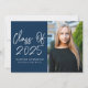 Moderna fiesta de graduación invita a presentar "Clase de 2025" en un guión escrito a mano en blanco sobre un fondo marino. Personalice la invitación de graduación al principio agregando el nombre del graduado, el nombre de la escuela y la foto vertical. La invitación se invierte para mostrar los detalles de tu fiesta de graduación con letras blancas en un fondo marino.
