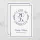 Envíe elegantes invitaciones para la celebración de su graduado con una moda azul marino sobre el emblema de la tipografía blanca que dice: CLASE DE GRADUADO [AÑO] con las palabras recorriendo el año en medio con hojas botánicas curvadas a cada lado del diseño circular. Debajo del emblema está el nombre del graduado con un tipo de letra azul oscuro y su escuela con un elegante tipo de letra sérico. Un rectángulo marino fino crea un borde cerca del borde. En la parte trasera se muestran los detalles de la fiesta de graduación. Reemplace el texto de ejemplo de la invitación para su graduado y evento. Personalízalo para cualquier tipo de graduado: escuela secundaria, universidad, posgrado, facultades de derecho, facultad de medicina o escuela de comercio. Copyright ©Claire E. Skinner. Todos Los Derechos Reservados.