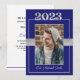 Esta invitación de graduación de clase azul y plateada de 2023 puede ser personalizada para invitar a ejercicios de iniciación y/o a una fiesta de graduación en honor al graduado. Esto funcionaría bien para los graduados masculinos o femeninos. La parte delantera muestra un retrato del estudiante graduado colocado de manera prominente con la 'clase del 2023' encima de la fotografía y el nombre del graduado debajo. También hay una cinta falsa en el medio detrás de la imagen. En la parte trasera se encuentra toda la información necesaria para asistir a las festividades. Una línea azul y la "clase de 2023" están en el borde inferior. Esta invitación funcionaría bien para las graduaciones de la escuela secundaria y universitaria.