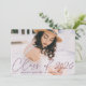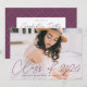 Invite a los huéspedes a celebrar el jardín con nuestras elegantes invitaciones para graduación de fotos. La parte delantera de las invitaciones a la fiesta de graduación muestra la foto del graduado con "Clase de 2023" en un overlay de escritura de caligrafía violeta y moderna. Personalice la parte delantera de la moderna fiesta de graduación agregando el nombre del graduado, el nombre de la escuela y el año de graduación. La invitación se invierte para mostrar los detalles de tu fiesta de graduación y un patrón geométrico punteado en color morado y blanco. El diseño es perfecto tanto para graduados de secundaria como universitarios.