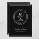 Envíe elegantes invitaciones para la celebración de su graduado con una moda blanca sobre el emblema de la tipografía negra que dice: CLASE DE GRADUADO [AÑO] con las palabras recorriendo el año en medio con hojas botánicas curvadas a cada lado del diseño circular. Debajo del emblema está el nombre del graduado con un tipo de letra blanco y su escuela con un elegante tipo de letra sérico. Un rectángulo blanco fino crea un borde cerca del borde. En la parte trasera se muestran los detalles de la fiesta de graduación. Reemplace el texto de ejemplo de la invitación para su graduado y evento. Personalízalo para cualquier tipo de graduado: escuela secundaria, universidad, posgrado, facultades de derecho, facultad de medicina o escuela de comercio. Copyright ©Claire E. Skinner. Todos Los Derechos Reservados.
