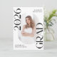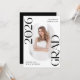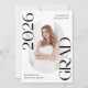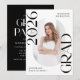 ¡Inviten a la familia y amigos a celebrar la graduación con estas elegantes invitaciones a la fiesta de graduación de fotos! El diseño de moda presenta "Clase de 2025 Grad" en negrita con letras negras con acentos de escritura sutiles con un fondo blanco sólido. La foto vertical del graduado se muestra dentro de un marco oblongo en el centro de la invitación. Personalice la parte delantera de la invitación a graduarse en blanco y negro con el nombre y la escuela del graduado. La invitación se invierte para mostrar los detalles de tu fiesta de graduación en blanco con un fondo negro. Esta invitación de fiesta de grado es perfecta para graduados de secundaria y universitarios.