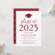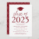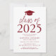 Invite a los huéspedes a celebrar el grado con nuestra moderna clase de invitados a la fiesta de graduación 2025. Las invitaciones incluyen un gorro de graduación en la parte superior con la "Clase de 2025" mostrada en letras modernas y burdeos. Personalice las invitaciones agregando el nombre del graduado, la escuela y los detalles de la fiesta de graduación. La fiesta de graduación de moda invita al revés a mostrar un patrón de enrejado blanco y borgoña.