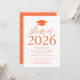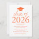 Invite a los huéspedes a celebrar el grado con nuestra moderna clase de invitados a la fiesta de graduación 2025. Las invitaciones incluyen un tapón de graduación en la parte superior con la "Clase de 2025" mostrada en letras modernas y naranjas. Personalice las invitaciones agregando el nombre del graduado, la escuela y los detalles de la fiesta de graduación. La fiesta de graduación de moda invita al reverso a mostrar un patrón de enrejado naranja y blanco.