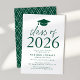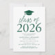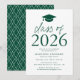 Invite a los huéspedes a celebrar el grado con nuestra moderna clase de invitados a la fiesta de graduación 2025. Las invitaciones incluyen un gorro de graduación en la parte superior con "Clase de 2025" mostrado en letras verdes y modernas. Personalice las invitaciones agregando el nombre del graduado, la escuela y los detalles de la fiesta de graduación. La fiesta de graduación de moda invita a revertir la vista para mostrar un patrón de enrejado verde y blanco.