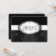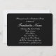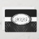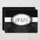 Invitación a la fiesta de graduación en blanco y negro con franjas negras claras y oscuras y una cinta blanca que cruza mostrando el año de graduación. La parte trasera de la tarjeta es de color negro con letra blanca para que la gente llene las invitaciones a la fiesta de graduación.