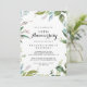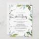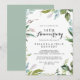 Esta invitación de aniversario de bodas de oro 50 tropical y elegante es perfecta para un aniversario moderno. El diseño presenta principalmente hojas tropicales verdes con un toque de flores de color rosa pálido dispuestas ordenadamente en guirnaldas y formas geométricas elegantes. Cambie el número para celebrar cualquier aniversario.