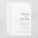 Esta invitación es una obra maestra de diseño minimalista, que refleja una combinación perfecta de elegancia clásica y simplicidad moderna. La tipografía negra aguda contra un fondo blanco prístino ofrece una invitación clara y legible que habla directamente de la sofisticación esperada en el boda de Sarah y Nelson. La cuidada disposición, que incluye un sutil guiño al estilo tradicional con su delicado guión para el encabezado, invita a los huéspedes a una celebración de amor dentro del tranquilo escenario de Maplewood House. Esta invitación no es sólo una invitación, sino un preludio a la gracia y refinamiento que esperan a los clientes.