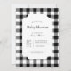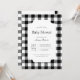 Invitación clásica y atemporal en cuadros negros y blancos para baby shower. Estilos de fuente y diseño personalizables, con un fondo simple y un patrón de cuadros geométrico y limpio. Perfecta para invitaciones de baby shower unisex, baby shower de niño, y baby shower con estilo preppy.