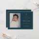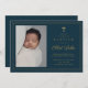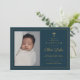 Este clásico elegante cruz dorada cruza foto Baptism Invitation presenta un sencillo marco y cruz de purpurina dorado, nombre de guión, foto vertical y texto limpio y editable en moda. Haga clic en el botón de edición para personalizar de este diseño.