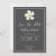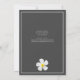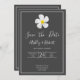 Un diseño sencillo y moderno con una flor simbólica, escritura blanca y un contorno blanco sobre gris oscuro. El reverso tiene todos los detalles del boda, personaliza la parte delantera y de vuelta a los detalles de su día especial. Una mirada clásica a un asunto formal. Estilo de coincidencia en Bridal Shower, RSVP, Save the Date y más. La flor hawaiana de Lei, Plumeria es un símbolo de "nuevos comienzos".