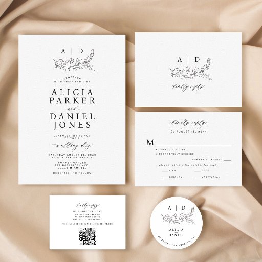 Modern, minimalist, classy, formal, monogrammed white and black typography wedding invitation featuring an elegant floral botanical leafy branch.