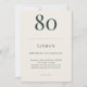 Deep forest green and linen cream birthday invitation featuring classic minimalist typography. Designed for a refined 80th celebration with customizable name age date time location and RSVP details.
