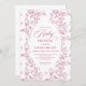 Celebrate your upcoming arrival with this elegant baby shower invitation featuring classic French toile de Jouy roses. Soft dusty pink, blush, and pink and white floral patterns create a timeless, romantic look accented by refined rose gold tones. Professionally printed by Zazzle, this design offers crisp details, beautiful color balance, and a smooth, high-quality finish that highlights the intricate rose pattern. Perfect for a classic, floral, or vintage-inspired baby shower, this invitation is fully customizable and arrives polished and photo-ready. A charming choice for welcoming baby with graceful, traditional floral style.