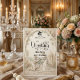 Transport guests to a romantic bygone era with this Regency-inspired engagement design, featuring a faux stone bas-relief effect and soft pastel florals.This design features a sophisticated trompe-l'œil (optical illusion) composition simulating the look of an antique stone carving. The visual center captures a silhouette of a couple in a traditional kneeling proposal pose, framed by an intricate archway of faux sculpted masonry. The "stone" features a warm, neutral cream and beige palette, accented by printed textures of pastel pink roses and sage green climbing vines that appear to grow over the arch. The typography hierarchy balances a bold Gothic blackletter font for the couple's names with a whimsical, flowing calligraphy script for the event details, set against a background of a distant gazebo temple and cobblestone path.