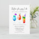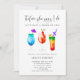 Una invitación a la ducha de novia divertida para tomar un ilustracion de coloridos cócteles tropicales. El texto dice "antes de que ella diga que lo hago, tomemos una o dos bebidas".