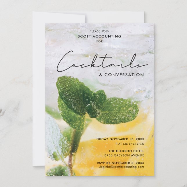 Cócteles y invitación a la conversación con un refrescante cóctel con menta, cubos de hielo y limón.