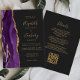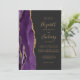 El borde izquierdo tiene un borde de agate color morado con un purpurina de imitación dorado. El texto del personalizable combina la escritura a mano de color dorado, las fuentes de copperplate y cursiva sobre un fondo negro de pizarra. El reverso proporciona espacio para los detalles del boda sobre un fondo negro de pizarra sólida, junto con un código QR que los huéspedes pueden explorar para visitar su sitio web y RSVP, lo que ahorra el coste de imprimir y enviar tarjetas RSVP separadas.