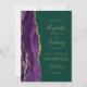El borde izquierdo tiene un borde de agate color morado con un purpurina de imitación dorado. El texto del personalizable combina la escritura a mano de color dorado, el copperplate y las letras cursivas en un fondo verde esmeralda. El reverso proporciona espacio para los detalles del boda sobre un fondo verde esmeralda sólido, junto con un código QR que los huéspedes pueden explorar para visitar su sitio web y RSVP, lo que ahorra el coste de imprimir y enviar tarjetas RSVP separadas.