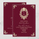 Elegante invitación de boda barroca en borgoña y dorado con un elaborado escudo monograma en la parte delantera y código QR moderno para confirmar asistencia en la parte trasera. Una mezcla perfecta de lujo y comodidad, esta invitación es ideal para bodas formales. Personalice fácilmente con sus nombres, fecha y sitio web de la boda. Los invitados pueden confirmar asistencia rápidamente escaneando el código QR, manteniendo su evento organizado con estilo.