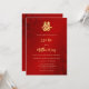 Esta elegante invitación a la boda china presenta un artístico símbolo de doble felicidad dorado sobre un fondo rojo de rubí floral. Nombres de novias y novios en un elegante guión escrito a mano. Invitación a la boda o a la ceremonia del té en China. Con un código qr escaneable en la parte trasera.
