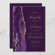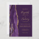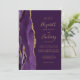 El borde izquierdo tiene un borde de agate color morado con un purpurina de imitación dorado. El texto del personalizable combina la escritura a mano de color dorado, las fuentes de copperplate y cursiva sobre un fondo de ciruela rico. El reverso proporciona espacio para los detalles del boda sobre un fondo sólido de ciruela, junto con un código QR que los huéspedes pueden explorar para visitar su sitio web y RSVP, lo que ahorra el coste de imprimir y enviar tarjetas RSVP separadas.