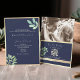 Captura la esencia del romance moderno con nuestra elegante invitación de boda botánica todo en uno, que combina el encanto boho con la sofisticación en dorado y azul marino. Adornada con vegetación rústica en acuarela, emana elegancia atemporal. Tu toque personalizado, una foto de la pareja, añade calidez e intimidad, mientras que el código QR dirige sin problemas a los invitados a responder y explorar tu sitio web de boda. Con una sencilla letra de caligrafía que marca el tono, invita a tus seres queridos a unirse a ti en este extraordinario viaje.