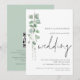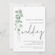 Invitación de boda con código QR en letra Script de Eucalyptus moderna. Agregar su código QR en el sitio web de su boda en la parte posterior hace que sea una opción conveniente para que sus invitados respondan y vean todos los detalles sin necesidad de tarjetas de RSVP y detalles por separado. Su código QR se generará automáticamente para actualizar el código de muestra en el diseño, cuando simplemente cambie la URL de muestra en la plantilla con la URL de su propio sitio web de boda. Estilo botánico minimalista, con un conjunto de letra manuscrita informal para "Boda" y el resto del texto que puede personalizar fácilmente. Una elegante rama de hojas de eucalipto en acuarela corre por el lado izquierdo.