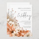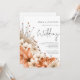 Boda con código QR de escritura de florales de otoño modernos. Agregar su código QR al sitio web de su boda en la parte posterior hace que esta sea una opción conveniente para que sus invitados respondan y vean todos los detalles sin la necesidad de tarjetas de respuesta y detalles separados. Un conjunto de escritura a mano para la boda y el resto del texto que puede personalizar fácilmente. Florales de colores otoñales en terracota, marrón y crema bajan por el lado izquierdo y en la parte inferior y también están en la parte posterior.