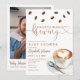 Esta elegante invitación de baby shower cuenta con granos de café y una taza de café y se puede personalizar con tus datos en tipografía elegante. El reverso cuenta con tu foto especial y un código QR de registro. Diseñado por Thisisnotme©