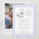 Esta adorable invitación de baby shower presenta un ganso pequeño y un fondo de cuadros azules. La parte de atrás incluye tu foto especial y un código QR de registro. Diseñado por Thisisnotme©