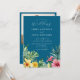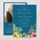 Esta elegante invitación de boda con flores tropicales de acuarela azul océano se puede personalizar con su información en tipografía moderna con el código QR del sitio web de su boda en el reverso junto a una foto especial. Diseñado por Thisisnotme©