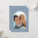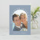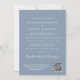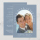 Anuncio de boda íntima o elopement azul polvoriento chic o invitación a recepción. La parte delantera presenta su foto en un marco arqueado y "Fiesta Felices para Siempre" en tipografía blanca elegante. Debajo de su foto, agregue sus nombres, fecha de la boda y ubicación. En el reverso, personalice su invitación, agregue sus nombres en una escritura similar a una firma e ingrese la dirección del sitio web de su boda para crear un código QR escaneable para que sus invitados lo escaneen para responder en línea y obtener detalles adicionales.